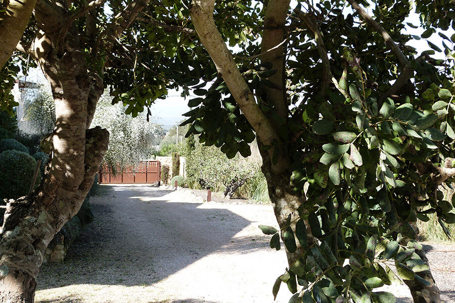 Vorbei an der hauseigenen Mandelbaumplantage, über eine private Zufahrtsstraße mit automatischem Tor, erreicht man dieses am Hang liegende herrschaftliche Anwesen.