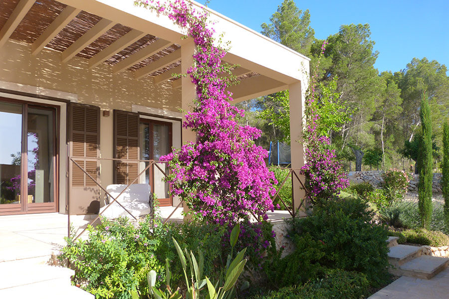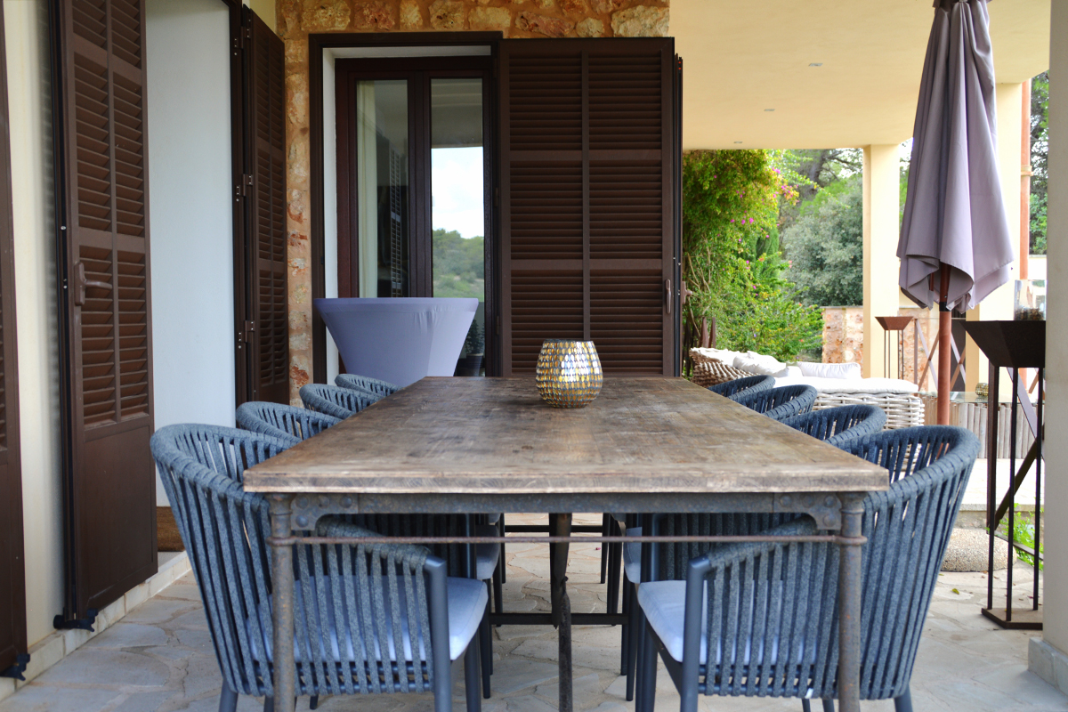 Die ausgewählten Materialien sind charakteristisch für diese Gegend. Gebrannte Tonziegel, Natursteinmauern, Sand- oder Kalkputz und "mallorquinische" Jalousien, rostfarbene Geländer und Türen und erdige Farben harmonieren mit der Farbenvielfalt der Umgebung.