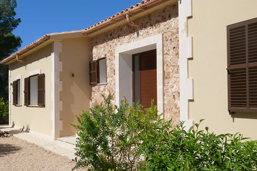 Die ausgewählten Materialien sind charakteristisch für diese Gegend. Gebrannte Tonziegel, Natursteinmauern, Sand- oder Kalkputz und "mallorquinische" Jalousien, rostfarbene Geländer und Türen und erdige Farben harmonieren mit der Farbenvielfalt der Umgebung.